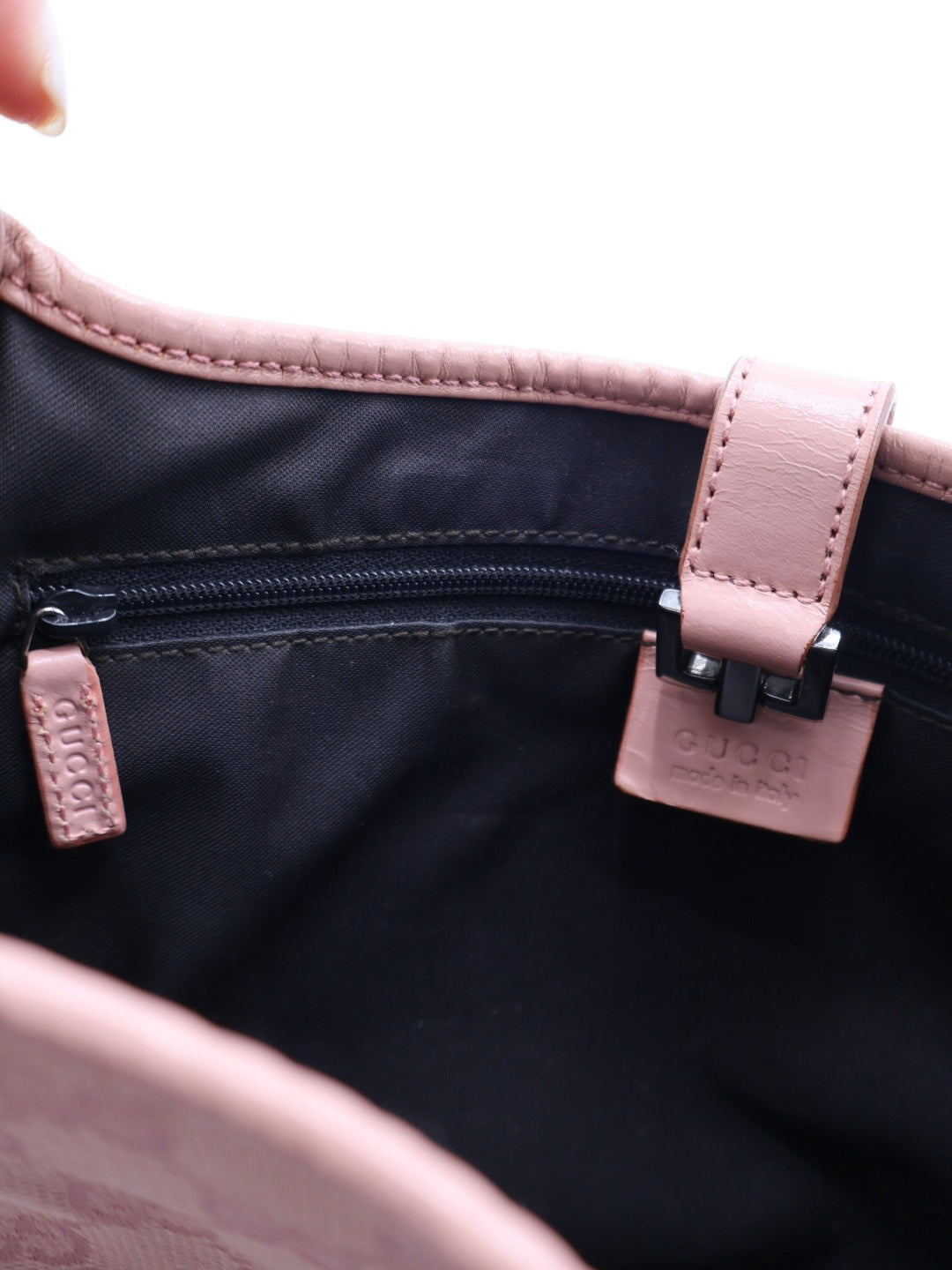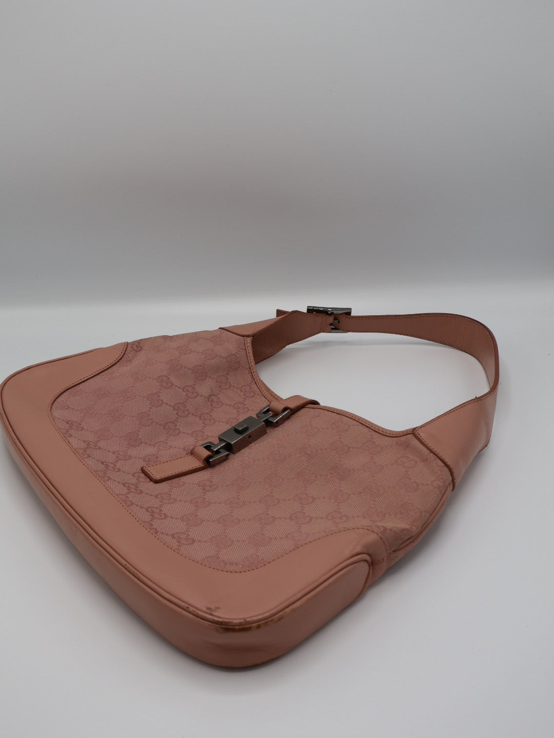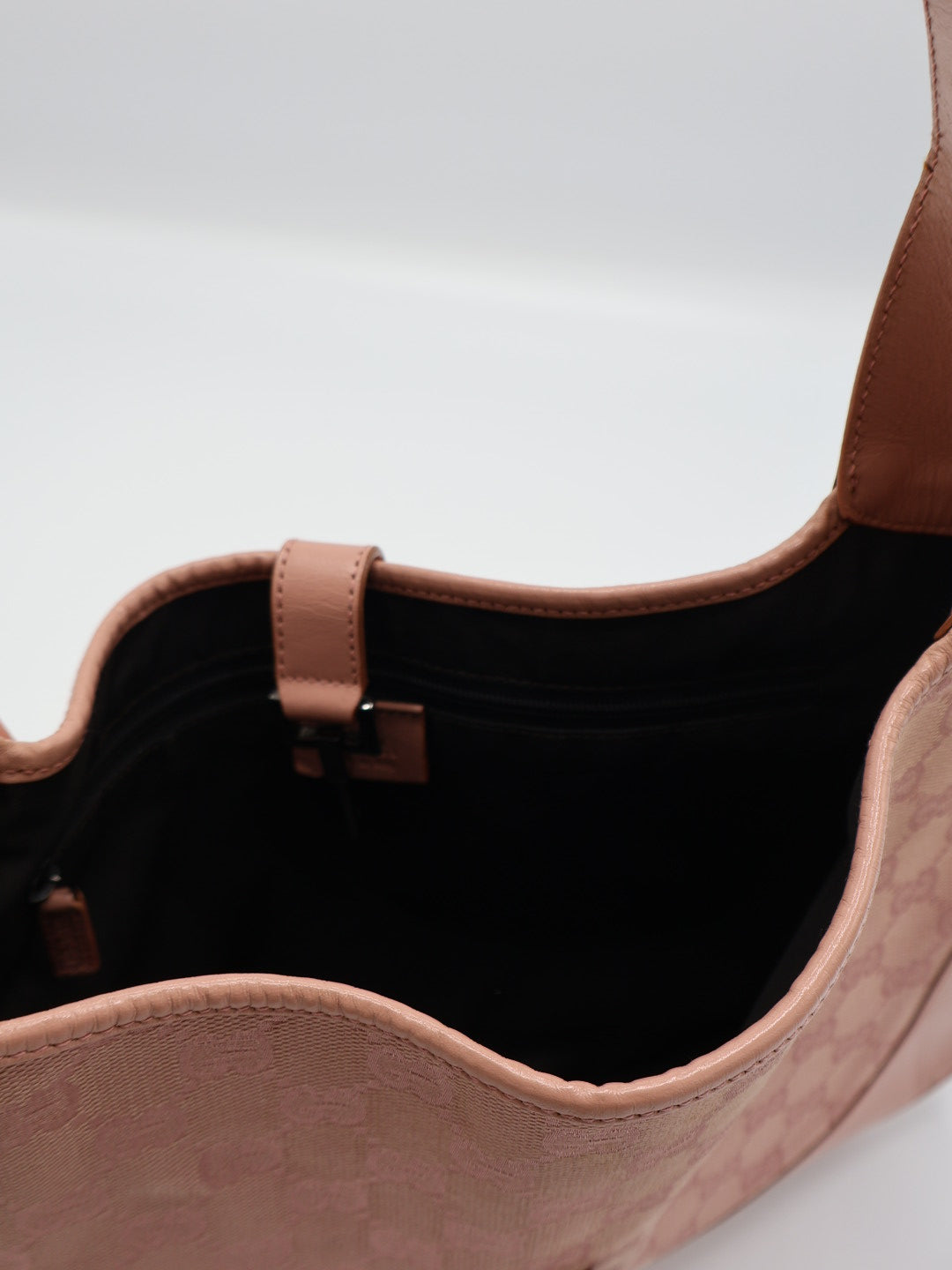 The Gucci Jackie is an elegant and timeless shoulder bag, beloved for its iconic shape and refined details. This model is crafted from pink GG canvas with matching leather accents and silver-tone hardware. The signature push-lock closure gives the bag a classic, recognizable look. A versatile and feminine piece that effortlessly adds style to any outfit.